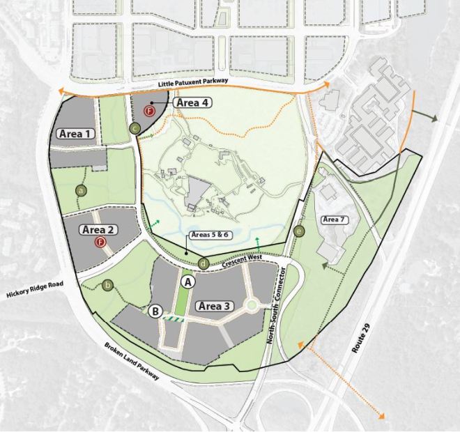 Site Plan, Crescent Neighborhood (Crescent Neighborhood Implementation Plan, Howard Hughes Corporation) – including open spaces and new street grid.