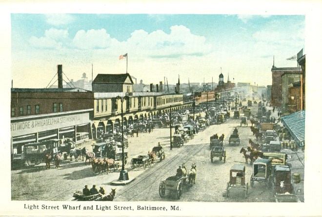 The Baltimore Post Office, built in the 1890s, was a towering presence, but an unbearable workplace. James H. Bruns, in Great American Post Offices (1998), notes that when the windows were open, drafts sickened the postal workers, and when the windows were closed, clouds of dust choked them. (The dust in these post offices contained dried manure from horse-drawn postal wagons, carried in on the mail sacks, with the odor of the stable. In post offices with overhead conveyors, a steady dusting of manure from the sacks fell upon the workers all day.) The Baltimore office’s main tower, although a landmark, was used only as a place to store old ledgers. [I believe the building was demolished about 1930.]